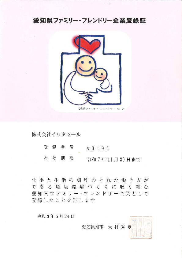 2021年5月24日 愛知県 ファミリー・フレンドリー企業登録証 認証