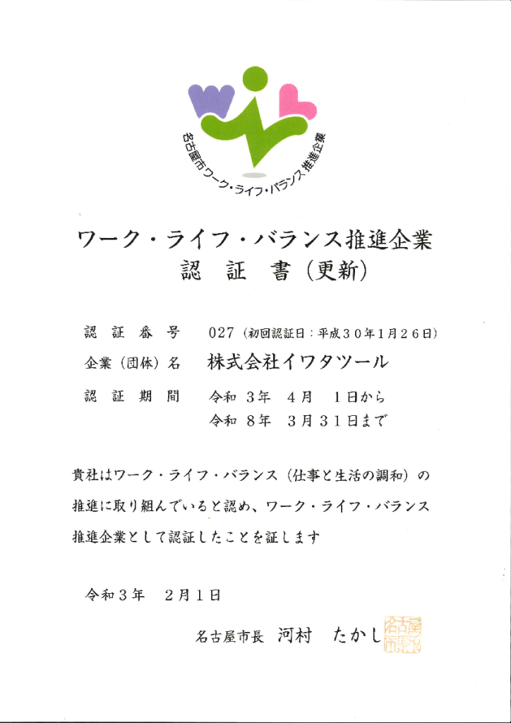 2021年2月1日 愛知県 ワーク・ライフ・バランス推進企業 認証